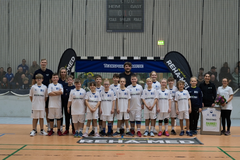 Gleich doppelten Grund zur Freude hatte die E-Jugend der SG Stahl bei ihrem Heimspiel gegen den TSV Wefensleben. Vor Anpfiff der Partie bekam die Mannschaft einen neuen Trikotsatz, gesponsert durch das Unternehmen Reha-Med Blankenburg, überreicht. Ein herzliches Dankeschön für dieses großartige Engagement in die lokale Nachwuchsförderung. Voller Stolz und durch das neue Outfit zusätzlich motiviert erkämpften die Harzer im Anschluss gegen den bis dahin verlustpunktfreien Tabellenführer ein überraschendes 21:21 (12:12).